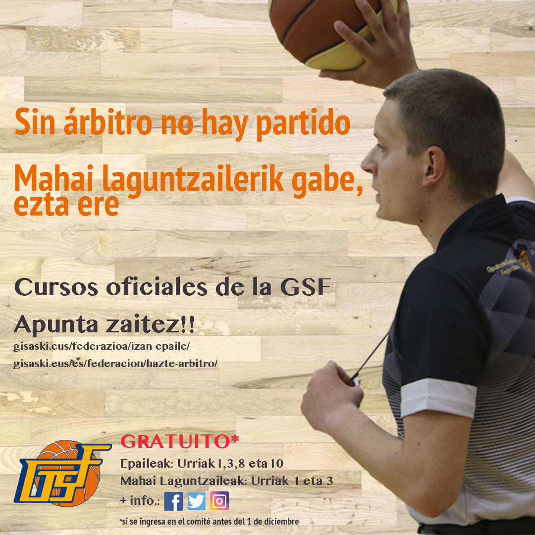 Sin árbitro no hay partido. Sin auxiliar de mesa, tampoco. Son dos figuras indispensables para que nuestro deporte siga creciendo. Por ello, la Federación Guipuzcoana de Baloncesto lanza su campaña de captación de árbitros y auxiliares de mesa. Los y las interesados/as podrán recibir una formación a primeros de octubre que les permitirá comenzar a desarrollar su labor de forma inmediata y remunerada.