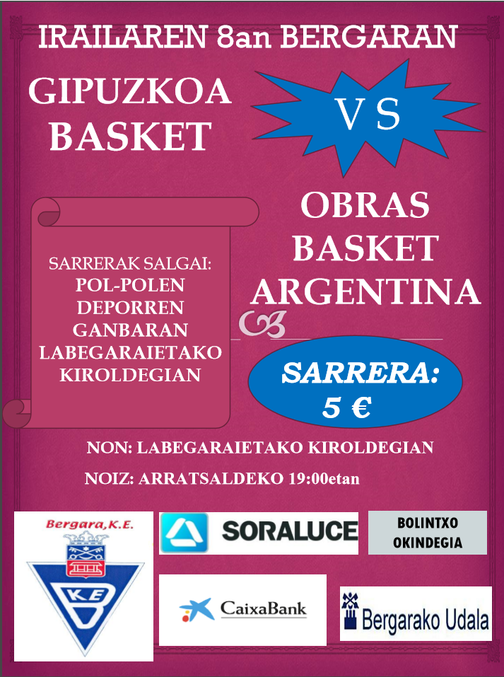 Gipuzkoa Basket se medirá a Obras Basket Argentina en el que será su segundo partido de pretemporada, tras la disputa la semana pasada de la Euskal Kopa.