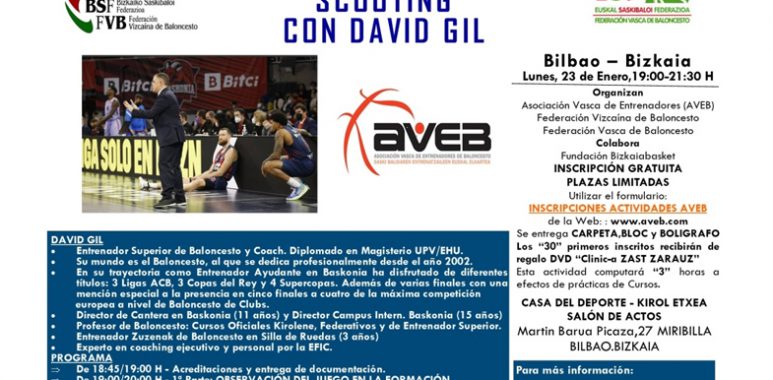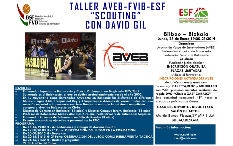 El próximo lunes 23 de enero, la Asociación Vasca de Entrenadores de Baloncesto (AVEB) junto a la Federación Bizkaina de Baloncesto (FViB) y la Federación Vasca de Baloncesto (ESF), en el Salón de Actos de la Kirol Etxea de Miribilla organizan el Taller AVEB & FViB & ESF «Scouting» con David Gil.