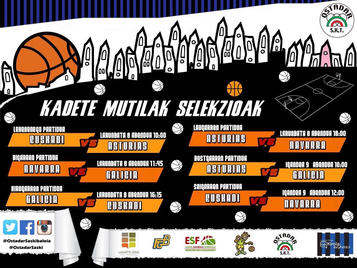 Euskadi, Asturias, Galizia eta Naffaroa (kadeteak) edo Gaztela eta Leongo (infantilak) gizonezko kadeteen eta infantilen saskibaloi selekzioak txapelketa batean arituko dira astebukaera hontan Lasarten eta Deban hurrenez hurren. Lau jokalari gipuzkoarrek kadeteetan eta hiruk infantiletan jokatuko dute lau selekzioen arteko txapelketa, espektakulua ziurtatuta dagoen leian.