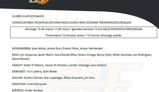 Mini-mutilen entrenamenduari dagokionez, arratsaldeko 17:30tan egingo da eta Mikel Ormaetxeak, Sergio Galdeanok eta Itsaso Agirrek zuzenduko dute. Jokalariek 17:15tarako prest egon beharko dute eta honako hauek daude deituta: